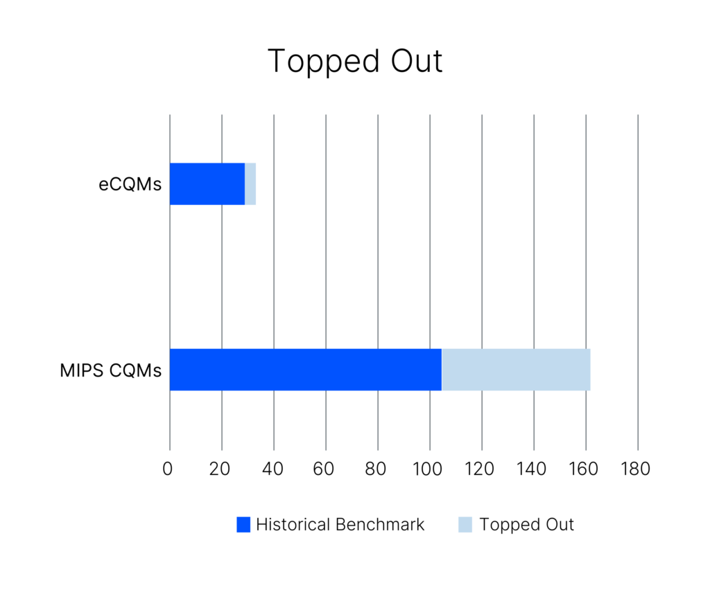 Topped-out measures, particularly those with a 7-point cap, require special attention. Of the 102 MIPS CQMs with historical benchmarks, 59 are topped out, with 48 having a 7-point cap. This means even perfect performance will only generate 7 points, not 10. Among the 29 eCQMs, 3 are topped-out, and 2 have a 7-point cap.