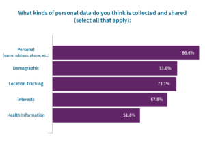 - When asked what types of data are collected and shared, the majority of respondents chose the typical information used in marketing initiatives, including personal (name, address, phone, etc.) (87%), demographic (74%), and location tracking (73%). Just over half of respondents (52%) selected health information.