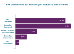 - However, while more respondents reported being very concerned (42%) or somewhat concerned (45%) about their personal data being shared, there was less concern around how health data is shared, with 35% reporting being very concerned and 39% being somewhat concerned.