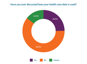 - While there is plenty of information about how personal data is used in marketing initiatives, it’s quite the opposite for health data, considering 61% of respondents indicated they have never discussed how their health care data is used.
