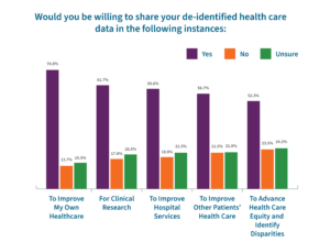 - This gap in knowledge of health data’s role in the health care industry becomes more apparent in willingness to share de-identified health information for purposes other than improving their health care. More than one-in-five respondents reported being unsure if they’d be willing to share their de-identified health care data for clinical research (21%), to improve hospital services (22%), to improve other patients’ health care (22%), and to advance care equity and identify disparities (24%).