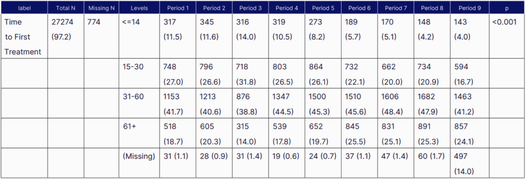 - 70.7% of all patients diagnosed from late 2021 to 2023 received their first treatment 31+ days post diagnosis (p-value <0.001)