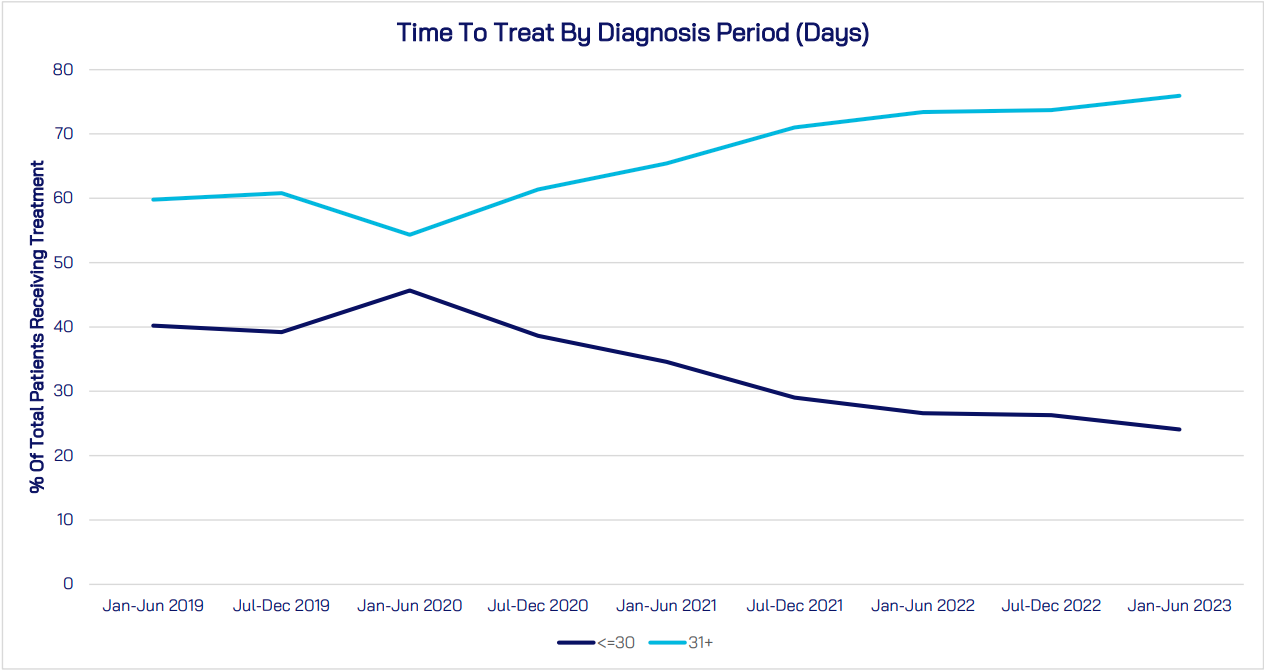 - 24.6% of patients diagnosed from late 2021 to 2023 received treatment within 30 days of diagnosis