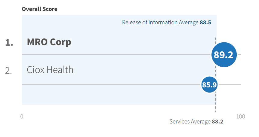 The 2021 Best in KLAS report includes performance indicators to help provide better context and transparency of vendor performance. In addition to displaying the overall KLAS score for each evaluated service, KLAS displays letter grades associated with the five key categories. As 2021 Best in KLAS, MRO was rated #1 for ROI with an overall performance score 89.2 out of 100. MRO also received A’s and B’s across all five graded categories.