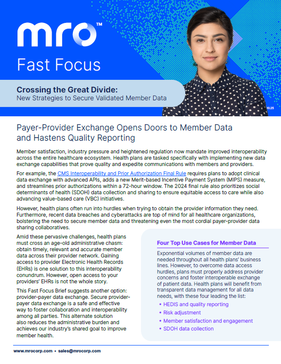 As health plans face increasing pressure to improve interoperability, payer-provider data exchange has emerged as a powerful solution. This Fast Focus Brief explores how secure data sharing accelerates quality reporting, streamlines prior authorization, and enhances member satisfaction. Learn how adopting advanced APIs and transparent data exchange helps meet CMS Interoperability and Prior Authorization Final Rule requirements, strengthen provider collaboration, and advance value-based care initiatives—all while safeguarding member data and reducing administrative burden.